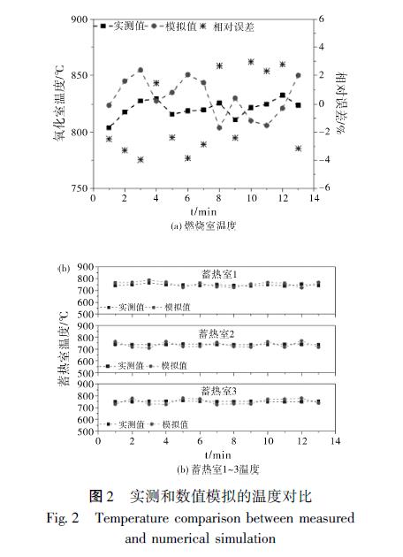 在連續(xù)監(jiān)測穩(wěn)定運行階段多個切換周期后, 將燃燒室三個熱電偶及變送器監(jiān)測的爐膛溫度值計算得到平均值, 同時將每個蓄熱室中的出口位置熱電偶的溫度值進(jìn)行記錄, 圖2 為同一測點的工程實際數(shù)據(jù)與數(shù)值模擬值的對比。通過對比, 得到溫度模擬數(shù)據(jù)與實際監(jiān)測值的相對誤差均在4% 以內(nèi), 這也可能