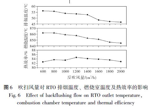 吹掃過程是通過吹掃風(fēng)機(jī)將殘留在蓄熱室內(nèi)的VOCs 帶入燃燒室, 以提高廢氣的效率[11] 。但目前RTO 反吹風(fēng)量的設(shè)計大多基于工程經(jīng)驗, 對不同工況下的實際運行參考性不高。為了研究吹掃風(fēng)量對RTO 裝置運行的影響, 試驗設(shè)定在廢氣流量8000 m3 / h, 切換時間2 min 且無電加熱的條件下, 模擬吹掃風(fēng)量從600 m3 / h 增加到2000 m3 / h 時出口溫度、燃燒室溫度和熱效率變化情況。如圖6 所示。由于吹掃風(fēng)是從排至煙囪的煙氣中抽取, 實際吹掃風(fēng)中含有的VOCs 濃度較低, 無法給燃燒室提供多的。同時, 過大的吹掃風(fēng)量增加了進(jìn)入進(jìn)氣和排氣蓄熱室的流量, 降低了實際發(fā)生氧化反應(yīng)的廢氣的預(yù)熱溫度, 且降低了出口溫度。雖然熱效率在1200 m3 / h 吹掃風(fēng)量附近有一定程度的增加, 但結(jié)合燃燒室溫度和經(jīng)濟(jì)因素,800 ~1000 m3 / h 區(qū)間內(nèi)較為合理與實際工程經(jīng)驗吹掃風(fēng)量占進(jìn)氣流量的10% 左右結(jié)論相近[12] 。同時可以看出, 吹掃風(fēng)量越大, 燃燒室的溫度越低, 需要開啟電加熱器提供熱量來提高燃燒室的溫度, 增加運行成本。